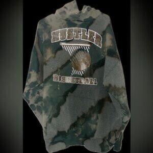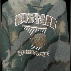 This is a rare and uniquely gifted item, featuring a natural color scheme of green and black in an oversized, boxy fit that's internationally sized but fits like a standard XXL. Slightly oversized for the mentioned size. It includes hues of green, deep green, navy, gold, black, cream, and other unique camo colors. This super awesome Hustle Hustler Basketball Hoodie Sweater Sweatshirt is distressed by hand and is considered rare and valuable. CAMO GREEN