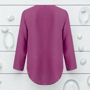 Add effortless sophistication to your wardrobe with this stunning purple V-neck blouse. Featuring a trendy half-front zip and rollable sleeves, this top transitions seamlessly from work to weekend. Its vivid hue and structured fit make it a must-have piece for anyone looking to make a fashion-forward statement. Whether paired with jeans or dress pants, it delivers both comfort and polish in one smart silhouette.
