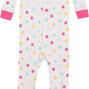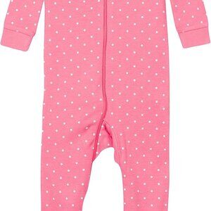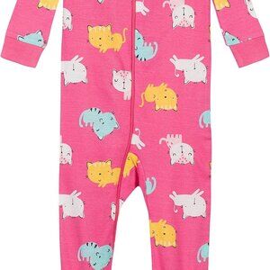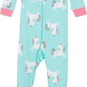 Features: This set includes four soft, breathable cotton footed pajamas with adorable unicorns and cats print. Snug fit for safe sleep, with front zippers and safety tabs for easy diaper changes. Flexible cuffs with spandex for a secure, comfy fit. Non-skid soles add a bit of traction — ideal for early walkers or cuddly nights.