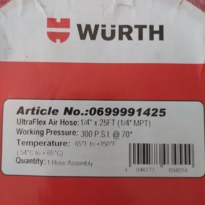 UltraFlex Air Hose WURTH 1/4" x 25FT 0699991425 1/4" MPT Pressure 300 P.S.I. 70