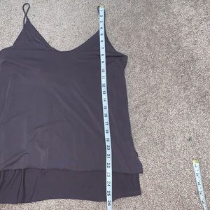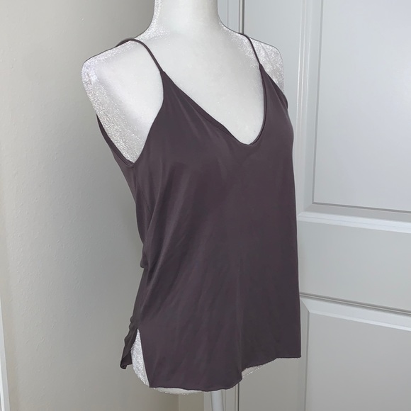 Mod Ref Basic Tank Top with Raw Hem. Spaghetti straps. Split hem on sides. Slightly longer in back. Double lined chest.