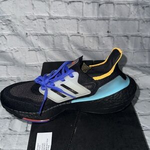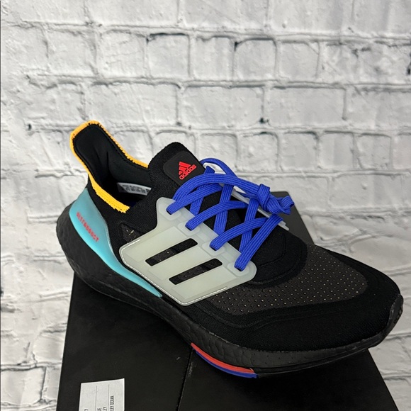Sleek Adidas sneakers featuring vibrant blue laces. Red and yellow details add a pop of color. Comfortable and stylish design.
