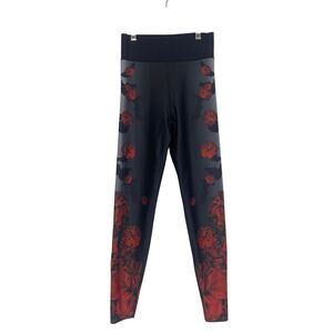 These leggings are gray and black with red rose print design. They have velvet stripe going up both sides.