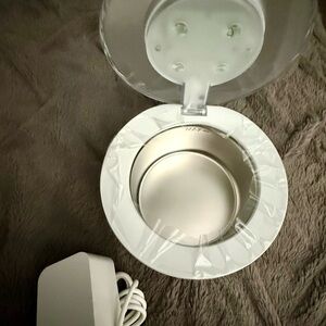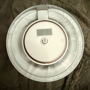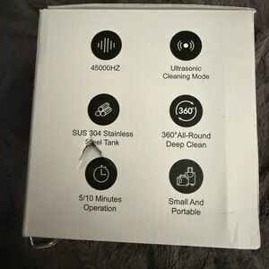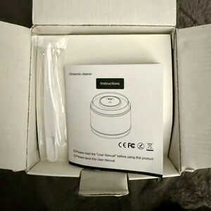 Compact ultrasonic cleaner. White body with a clear lid. Simple top display and one-button control. Great for jewelry, dental retainers/dentures and other small items.