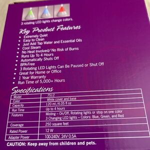 Extremely quiet. Easy to clean. Just add tap water & essential oils. Cool steam. No heat involved. No risk of burns. Runs up to 4 hours. Automatically shuts off. 3 rotating LED lights can be paused or shut off. Great for home or office. White cover & base. Coverage 250 square feet.