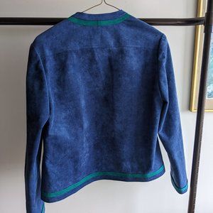 Blue suede jacket with a green suede trim. I loved this jacket but never wore it because it was slightly too small for me. Purchased used in excellent condition!