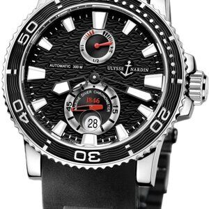 Ulysse Nardin Maxi Marine Chronometre 'Gold Medals' Black Wave Edition in Stainless Steel and Black Titanium, Black Wave Dial with Luminescent Hour Markers and Hands. Unidirectional rotating black-ion-plated bezel with diver time graduations. There is a sapphire crystal and minute markers around the outer track. The date aperture is at 6 o'clock. Self-winding UN-26 movement with power reserve indicator and oversized small seconds hand. The solid three-body 42.7mm case and curved lugs are polished. Black rubber strap with black titanium and ceramic elements and a double fold-over deployant buckle.