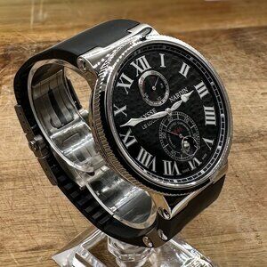 This Ulysse Nardin 263-67 features a 43mm stainless steel case paired with a striking black dial and classic leather strap. It is powered by a reliable automatic movement. The timepiece comes complete with its original box and certificate, making it an excellent piece to add to your collection.