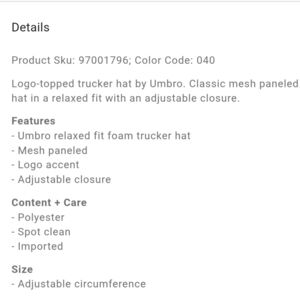 Logo-topped trucker hat by Umbro. Classic mesh paneled hat in a relaxed fit with an adjustable closure.