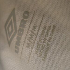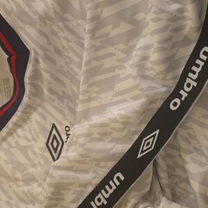 Stylish Umbro jersey with a white base and red accents. V-neck design for a sporty look. Ideal for casual wear or sports activities.
