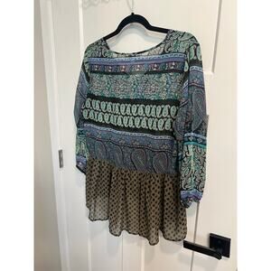 Umgee 3/4 Sleeve Boho Gypsie Whimsical Blouse Size L Button Front Teal Blues