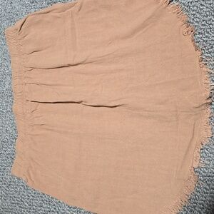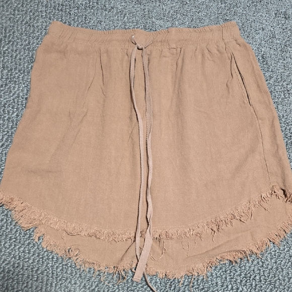 Casual linen-blend skirt with an elastic drawstring waist. Frayed hem detail and relaxed silhouette. Soft dusty rose tone for easy styling.