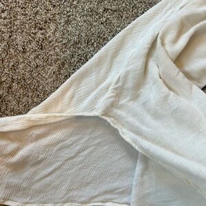 Cute summery top. Wear alone or as a swimsuit coverup. Also cute with jeans. Longer length on the sides. Split hem. Cotton/poly mix. Lace and floral design. Criss cross back. This top has been worn. It has no stains or holes. There are some loose threads along edges that could easily be trimmed off. There are also a few pulled threads on the back. See pics. These are not holes and do not affect integrity of shirt. The fabric has some natural variations. Almost like linen. Very lightweight.