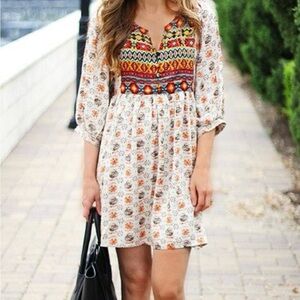 Umgee Aztec Dove Pattern 3/4 Sleeve Tunic Mini Dress Boho Western Rodeo Sz Small