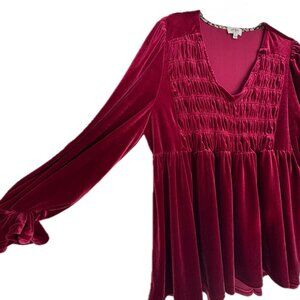 Umgee Velvet Smocked Ruching Blouse. Size: L. Color: BURGUNDY dark red. Super soft velvet material with lots of stretch. This top is so flattering and could fit many different sizes due to the smocked bodice and stretchy, soft material.