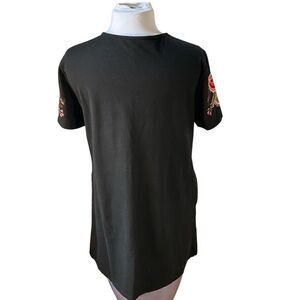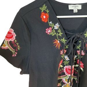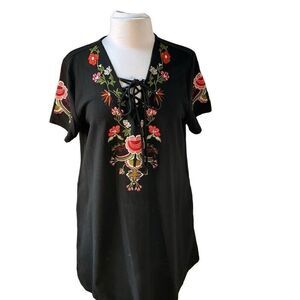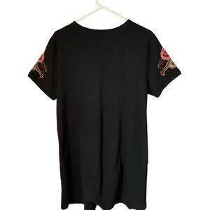 Umgee Embroidered Tshirt Dress. Black. Large. Mini. Straight cut. Short sleeves. Ties at Vneck. Pockets! Floral embroidery down front and arms. Perfect summer dress or coverup!! Flat lay 35” L, 20” P-P. 55% poly, 38% cotton, 7% rayon. Flowy. #beachy #vacamode #boho