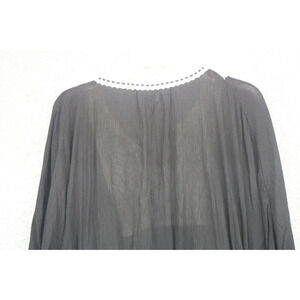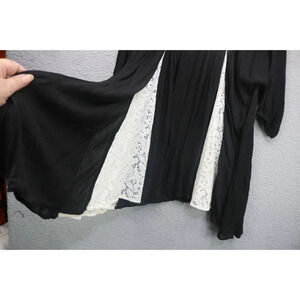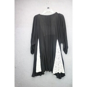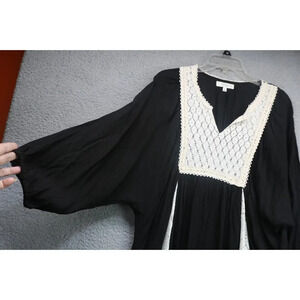 This is an Umgee Black and Ivory Lace A-Line Dress that is a size XL. It is semi-sheer and has Dolman Sleeves. It has a very full skirt with an asymmetrical hemline. It is 60% Cotton and 40% Polyester. Laying flat, it measures: Armpit to armpit-26" and the length is 33.5". It could serve as a beach cover-up as well. Very pretty and in great condition.