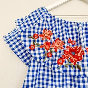 Umgee Blue Gingham Floral Embroidered Off the Shoulder Dress Small