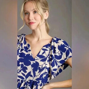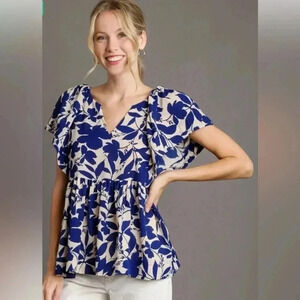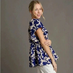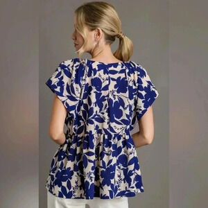 Stylish floral blouse by Umgee. Features a blue and white pattern. Short sleeves and a flattering fit. Size Medium. Excellent condition.