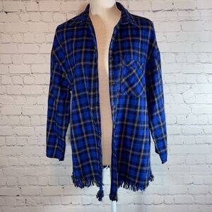 Umgee Blue Plaid Raw Fringe Hem Button Down