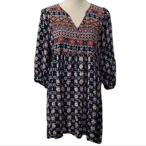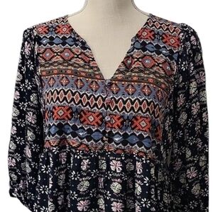 Embrace a bohemian vibe with this stylish patterned top/dress. Featuring a mix of blue, red, and black, this piece is perfect for any casual outing. Smoke free home.