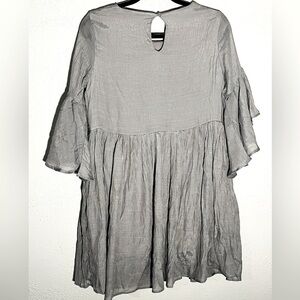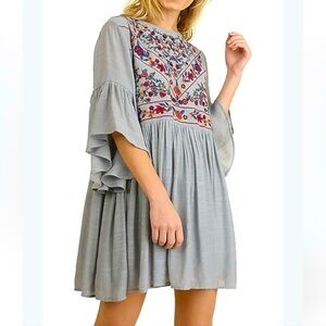 This Umgee dress in size S features floral embroidery on a cool gray cotton blend fabric. With a round neck, flared 3/4 sleeves, and a button closure, this fit & flare mini dress is perfect for various occasions like parties, casual wear, or even business events. The dress has a boho, hippie vibe with colorful accents, making it a stylish and lightweight option for summer, fall, or spring.