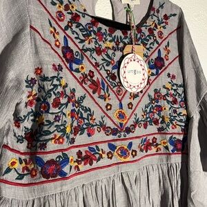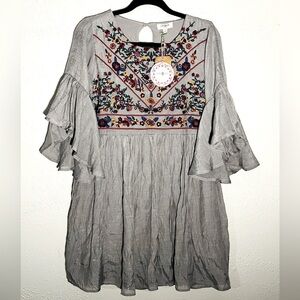 Umgee Boho Embroidered Art Dress SZ S Cool Gray Colorful NWT