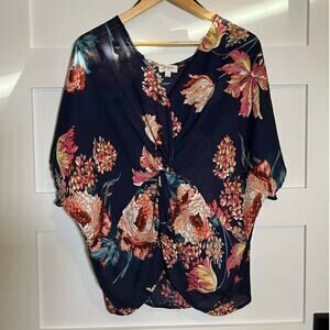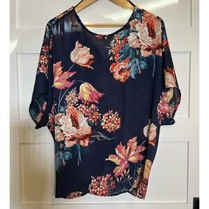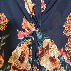 Umgee Boho Floral Semi Sheer Twisted Front Navy Blue Oversized Blouse Top Small