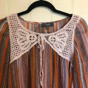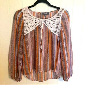 Umgee Boho Striped and Crochet Tie Neck Sheer Blouse Size S