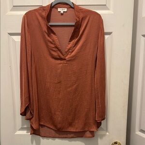 This Umgee blouse features a relaxed fit with a mandarin collar, offering a stylish and comfortable look. The brown color adds a warm, earthy tone, perfect for any occasion. Its flowy design and long sleeves make it a versatile addition to your wardrobe.