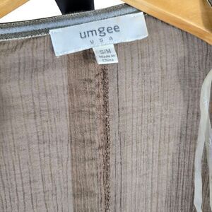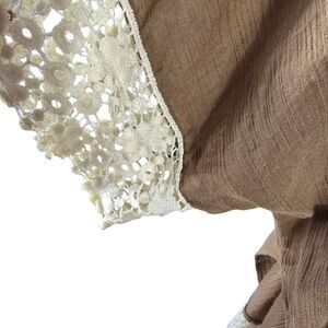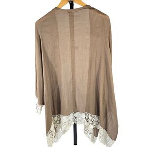 Stylish open-front sweater by Umgee. Features a brown body with cream lace trim. Perfect for layering. like new