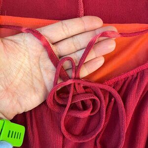 The dress originally had subtle sun-fade streaks, so it was professionally upcycled with a deep burgundy wine dye, giving it a rich, even tone and a more elevated look. The stitching on the back ties created a cool contrast effect during the dye bath (shown in photos). The tag was removed before dyeing but measurements were taken prior.
