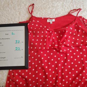 Features: stunning red dress with white polka dots. glam ruffles with a sexy cold shoulder. easy pull, pop over. super comfortable Spaghetti straps. Boutique clothing item. 100% Authentic.