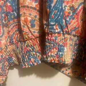Vibrant paisley design. Features a stylish V-neck. Ideal for casual wear. Has no fabric tag