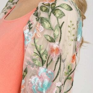 Umgee Coral Shirt with Floral Embroiderd Sheer Sleeves Size Large