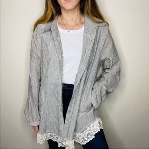Umgee Cotton Blend Beige White Stripe Lace Trim Button Front Shirt XL