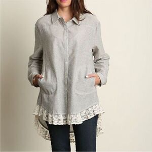 Umgee Cotton Blend Beige White Stripe Lace Trim Button Front Tunic Top Shirt XL