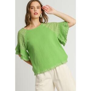 Umgee Cotton Gauze Round Neck Ruffle Eyelet Layered Sleeves Flowy Blouse | Lime