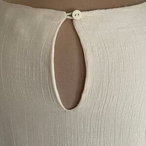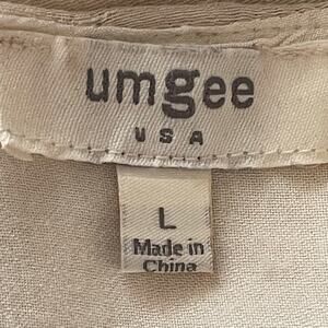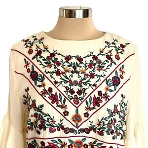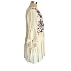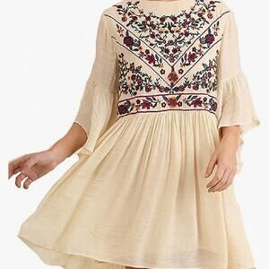 Umgee Cream Boho Bliss Embroidered Dress Sz LARGE Hippie Fairy Peasant Babydoll. Cream color crinkle gauze with lining. 3/4 length bell sleeves. Flowing style. Approximately knee length or slightly above. Keyhole button closure at back neckline. 60% cotton, 40% polyester. In excellent preowned condition.