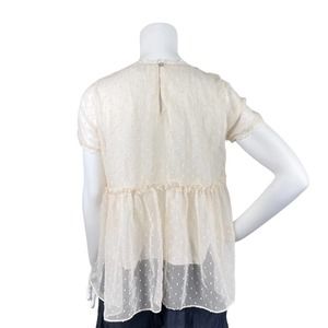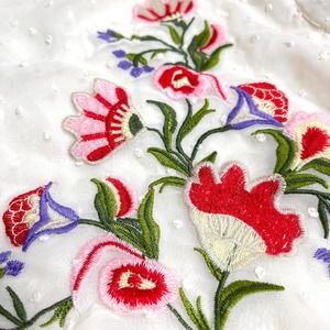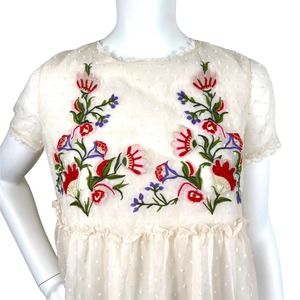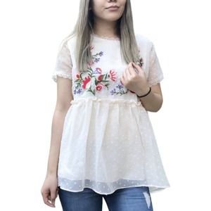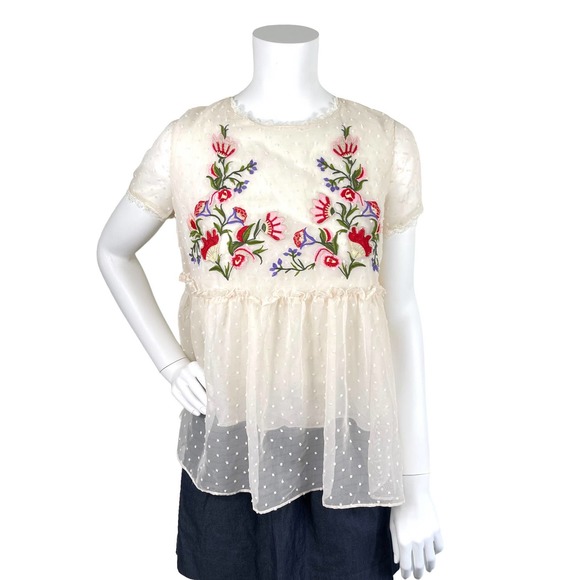 Charming cream blouse with vibrant floral embroidery. Short sleeves and delicate texture. Perfect for casual outings.