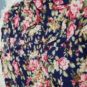 Floral dress with snap opening at neckline and flare sleeves Approximate length from shoulder to end of dress is 33 inches Good condition
