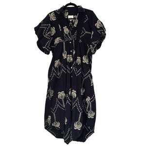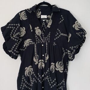 Umgee Dress Palm Tree Embroidered S Black Puff Sleeve Smocked Boho Resortwear