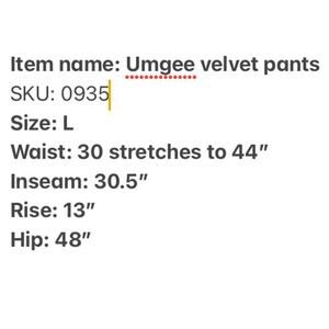 Umgee brand women's wide-leg velvet pants in green with white/ beige stripes. The pants have a smooth, velvety texture and are designed for both casual and dressy occasions