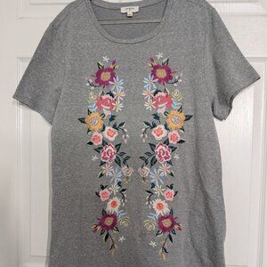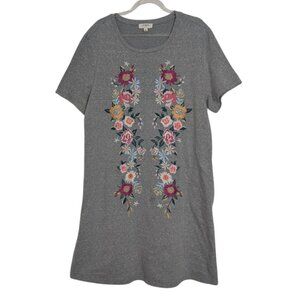 Umgee Embroidered Floral T Shirt Dress Womens Size Large Gray Short Sleeve