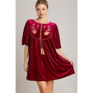 Umgee Embroidered Half Sleeve Velvet Mini Dress with Tassel