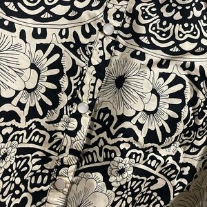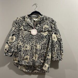 Get in my closet! Black and cream floral top with flutter sleeves and pearl snap buttons. This too can be dressed up with a pair of pants, skirt, or dressed down with a pair of jeans. The looks are endless with this versatile piece. 100% cotton (no stretch). Model is in a size S.