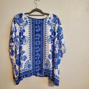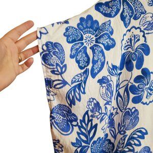 Umgee Floral Border Pattern Round Neck Short Sleeves Oversized Blouse Blue L
