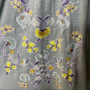 Umgee embroidered jersey mini dress, size Medium. Light sea foam green, 100% cotton jersey tunic shift dress, with purple and yellow floral embroidery. Slight scoop neckline with puff sleeves. Sleeves have elastic cuffs to maintain the puff and are lined with polyester, body of dress is unlined. In excellent condition, without flaws.