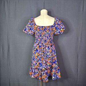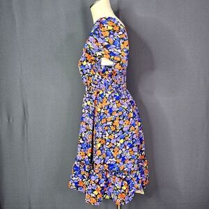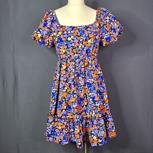 Vibrant floral dress with puff sleeves. Features a mix of purple, orange, and blue flowers.