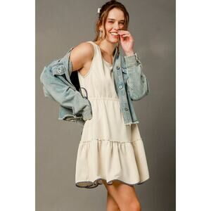 Umgee Frill Drawstring Waist Scoop Neck Loose Fit Casual Mini Tank Dress | Cream